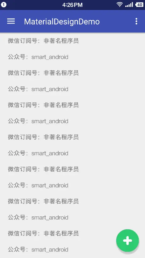 掌握了我给你们说的那几个属性,就基本掌握了FloatingActionButton的用法了。FloatingActionButton之所以出现这么久了,不太火,不太常用,估计跟他悬浮有关,容易挡住其他内容。那我们现在就研究改如何在滑动列表时隐藏和显示这个悬浮按钮FloatingActionButton。