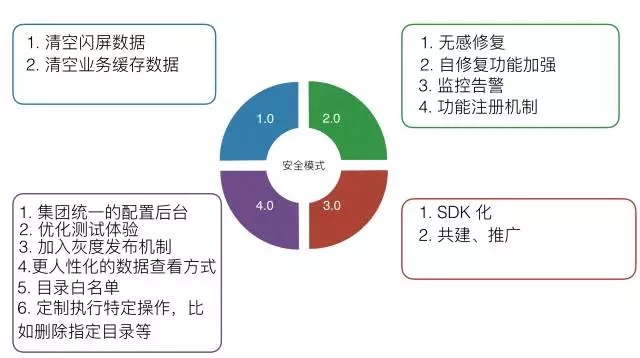 天猫安全模式重点放在了解决启动阶段问题上,从配置后台、客户端能力、数据、测试四个方面给出了统一的解决方案,同时也考虑到了不同APP的兼容性问题。