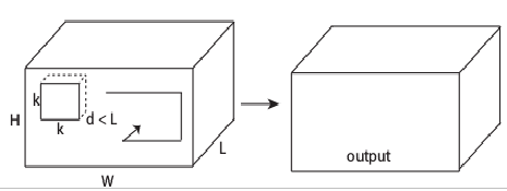 3D CNN 应用于一个视频帧序列图像集合,并不是简单地把图像集合作为多通道来看待输出多个图像(这种方式在卷积和池化后就丢失了时间域的信息,如图6上), 而是让卷积核扩展到时域,卷积在空域和时域同时进行,输出仍然是有机的图像集合(如图6下)。