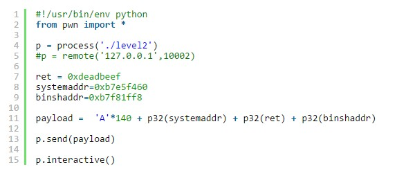 我们首先在main函数上下一个断点,然后执行程序,这样的话程序会加载libc.so到内存中,然后我们就可以通过”print system”这个命令来获取system函数在内存中的位置,随后我们可以通过” print __libc_start_main”这个命令来获取libc.so在内存中的起始位置,接下来我们可以通过find命令来查找”/bin/sh”这个字符串。这样我们就得到了system的地址0xb7e5f460以及"/bin/sh"的地址0xb7f81ff8。下面我们开始写exp: