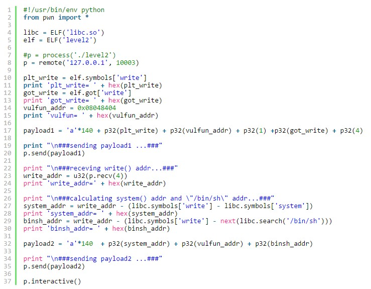 因为system()函数和write()在libc.so中的offset(相对地址)是不变的,所以如果我们得到了write()的地址并且拥有目标服务器上的libc.so就可以计算出system()在内存中的地址了。然后我们再将pc指针return回vulnerable_function()函数,就可以进行ret2libc溢出攻击,并且这一次我们知道了system()在内存中的地址,就可以调用system()函数来获取我们的shell了。