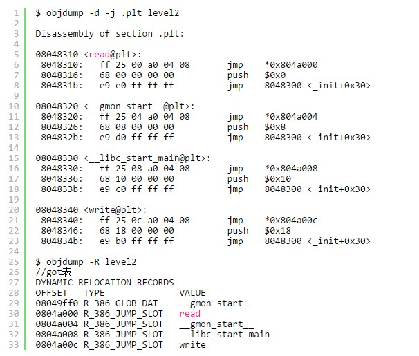 所以我们只要把返回值设置到程序本身就可执行我们期望的指令了。首先我们利用objdump来查看可以利用的plt函数和函数对应的got表: