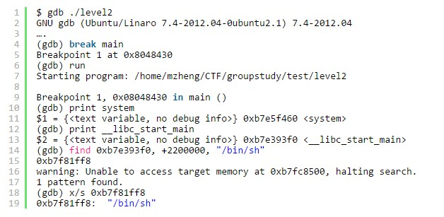 那么如何执行shellcode呢?我们知道level2调用了libc.so,并且libc.so里保存了大量可利用的函数,我们如果可以让程序执行system(“/bin/sh”)的话,也可以获取到shell。既然思路有了,那么接下来的问题就是如何得到system()这个函数的地址以及”/bin/sh”这个字符串的地址。