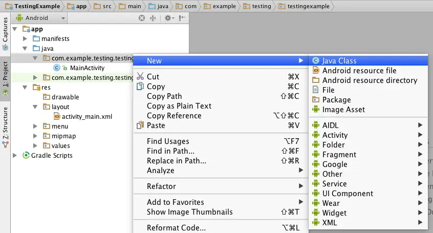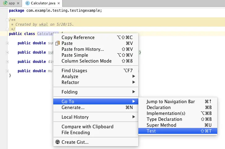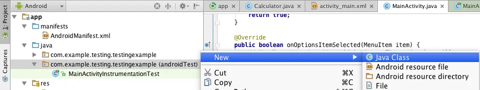 Android Studio提供了一个快速创建测试类的方法。只需在编辑器内右键点击Calculator类的声明,选择Go to > Test,然后"Create a new test…"