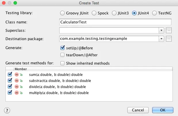 这样,就会在正确的文件夹内(app/src/test/java/com/example/testing/testingexample)生成测试类框架,在框架内填入测试方法即可。下面是一个示例: