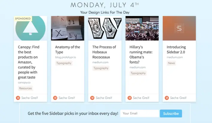 每天通过邮件为你推送5篇最优秀的设计文章,如果你没有时间进行其他阅读,可以订阅Sidebar的推送服务。