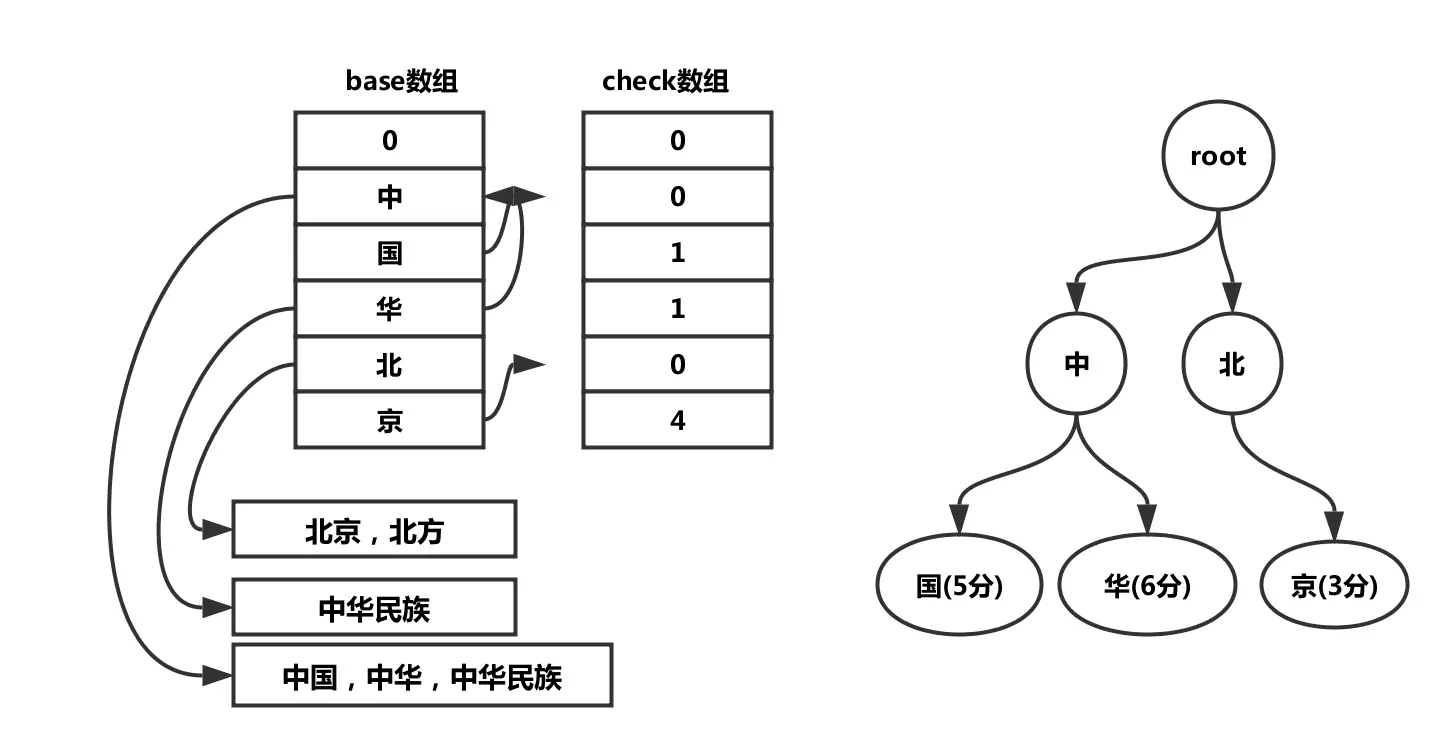 Trie树实际上是一种有限状态机,通过状态转移矩阵在各个状态之间跳转,双数组Trie树极大的节省了空间,大致就是下面这个样子,我后面会有一篇专门的文章来说Trie树实现的,这里就不详细展开了,实在等不及的可以自己先搜索一下相关资料看看双数组Trie树吧。