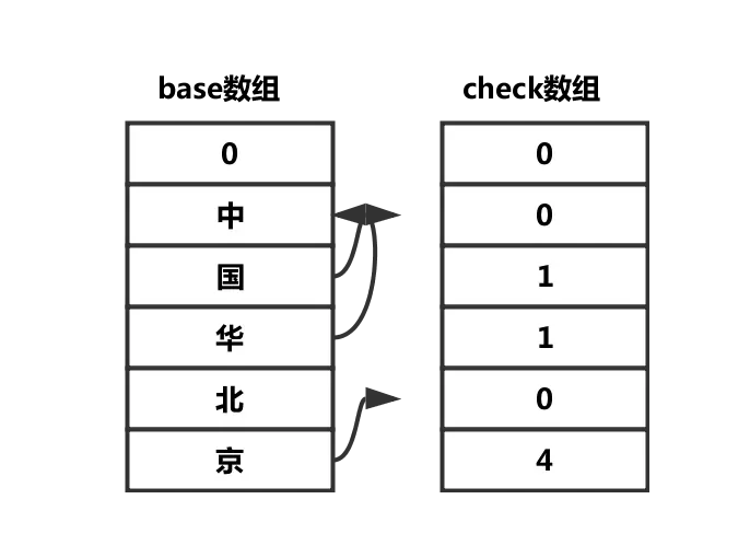所谓双数组Trie树,当然就是通过两个数组来实现这棵树了,这两个数组分别叫base数组和check数组,一个是基础数组,一个是检查数组。