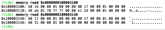 看到我选中的那个字节,那是我们的一个实例变量,在这个实例变量的前面有 8 个字节的内容,那实际就是虚表的地址了,我们尝试将这个地址所指向的内容拿出来: