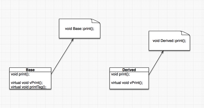 在上面的代码中,我们声明了一个父类 Base,和它的一个派生类 Derived,其中 print() 实例方法是非虚函数,而其余两个实例方法被声明为了虚函数。并且在子类中我们重新了 print() 和 vPrint()。下面我们构造出一个 Derived 实例,并分别将其地址赋给 Base 指针和 Derived 指针: