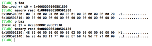 到这里,我们已经大致了解了虚函数是怎样工作的了。下面我们看看 Base 类和 Derived 类的虚表有什么区别。我修改了源码,实例化了一个 Base 类对象 baz,然后分别 dump 出 Base 类和 Derived 类的内存: