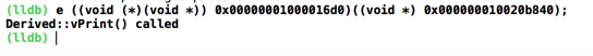 可以看到,Derived 类中重写的 vPrint() 方法已经被执行。这就说明虚函数在执行时是一个动态的过程,并不是在编译时就确定下来要执行哪一个函数,而是运行时从虚表查到真正要执行的函数的地址,然后再将 this 指针传入执行。