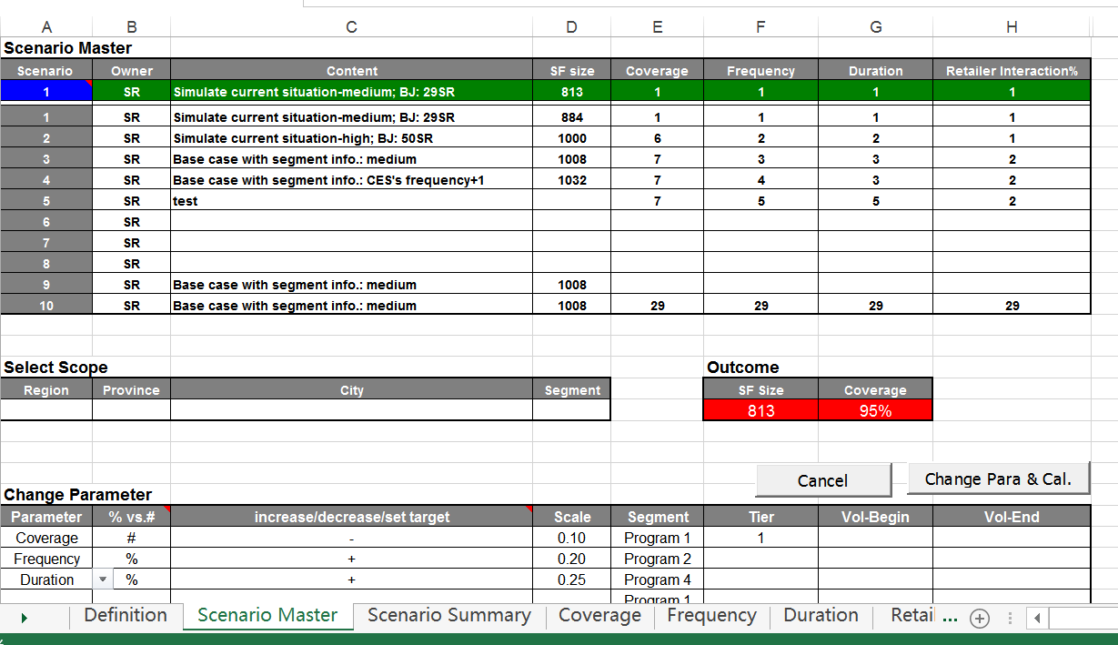 于是只好再次祭出Excel+VBA法宝。先根据常规思路建立好Financial Model,得出HC的初步结果。然后写VBA程序,根据不同的情景、不同的优先级以及不同的权重来调节零售店的覆盖率、销售拜访频率、拜访中的服务深度等多因素,同时设定这几大因素的可接受范围,逐步逼近HC的预设值。