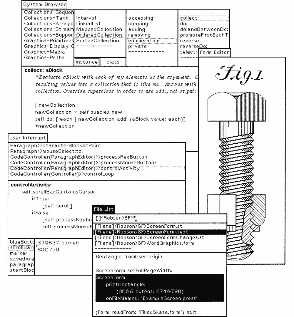 更细致地检查早期的图形用户界面,我们意识到它们多数的元素是书面语。这些 GUIs 是彻底的纯文本 ——— 独立词组的罗列集合。