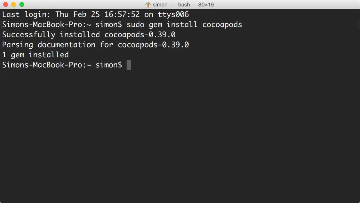 CocoaPods 的配置简单而直观,一路打怪升级。首先在终端中输入以下命令来安装 CocoaPods: