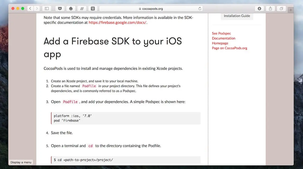 pod 'Firebase')是让 CocoaPods 知道我们要用 Firebase。或许你会好奇,我们怎么知道某个库的 pod 名称的。一般情况下,你可以查看文档,或者在 cocoapods.org 搜索。