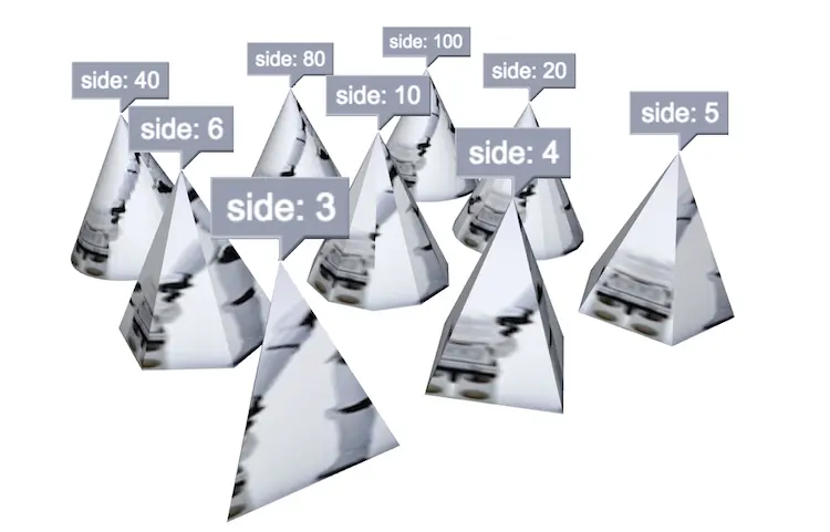 [3, 4, 5, 6, 10, 20, 40, 80, 100].forEach(function(side, index) {