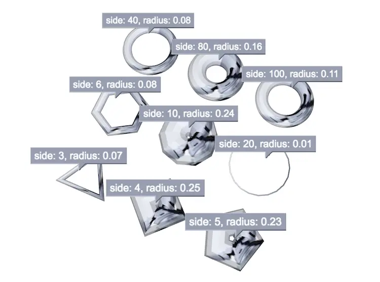 在上图中可以看到 note 中多加了一个 radius 值的打印,这个值对应的是样式中的 shape3d.torus.radius,那么这个值的作用是什么呢,我想从上图也可以看得出来,radius 值是用来控制圆环的半径,但是为什么 radius 为 0.25 的时候圆环中间就被填上了,没有像其他的圆环中间都漏空呢?我们可以这样理解,一个圆环的切面有两个圆环直径,那就有四个圆环半径,那按百分比去计算的话,一个半径就是占整个图元宽的 1/4,也就是 0.25,所以这个 shape3d.torus.radius 样式的取值范围为 0~0.25。
