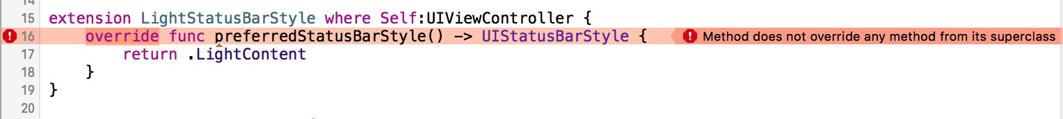 }有的vc的状态栏是白色,有的是黑色,总这样override一个方法也是挺碍眼的,那能不能把这个代码移进protocol的extension中呢? 这样的话用起来就像这样: