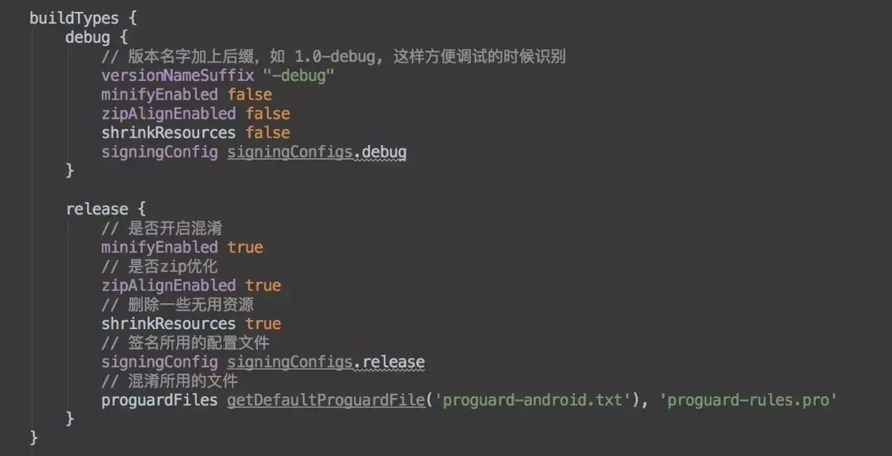 buildTypes 意为编译类型,这里声明了 debug 和 release 两种类型,当然你也可以声明其他类型,名字随意取,可以看到 debug 和 release 两种类型签名所用的配置不一样,这个配置具体详细也就是在上部分 signingConfigs 节点指定的,那里面的一些密码信息是在你生成 keystore 文件时设置的。