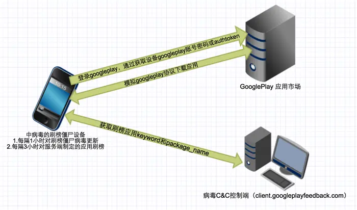 随着移动端应用市场数量爆炸式增长,App推广和曝光率也越来越难,自然App刷榜也就形成了一条产业链,哪里有需求哪里就有生财之道!近期,阿里移动安全发现一款应用,该应用官方的一个版本捆绑了多个病毒,目的是对GooglePlay商店应用刷榜和刷大量未知应用安装量。该病毒在该设备锁屏时对设备root,root成功后向系统目录植入“刷榜僵尸”病毒,“刷榜僵尸”对指定应用在GooglePlay商店上恶意刷量,同时还会诱骗用户安装“下载者”病毒,“下载者”病毒会在设备屏幕亮起状态会弹出广告页面,若用户触碰广告页面推广的应用将会自动安装运行。该病毒技术相当成熟我们对恶意应用的证书对比,惊人的发现并非被重打包!