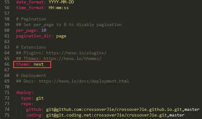 接下来我们只需要将站点下的_config.yml配置文件中的主题配置更换成Next,如下图: