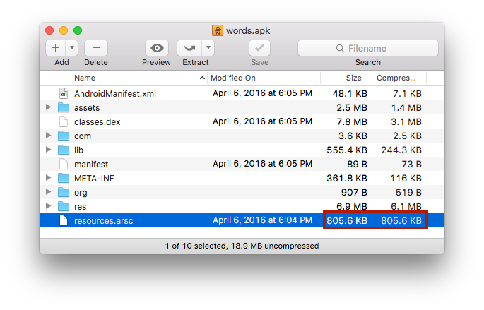 resources.arsc 中存储的是资源 ID 和资源名称的对应关系。从下图中可以看到在正常情况下这个文件在 apk 中是非压缩性存储的。然后就有好多文章和工具(真的是好多…)出于 APK 瘦身的目的,压缩了这个文件。看起来没有问题,但这其实确实不是一个好主意……