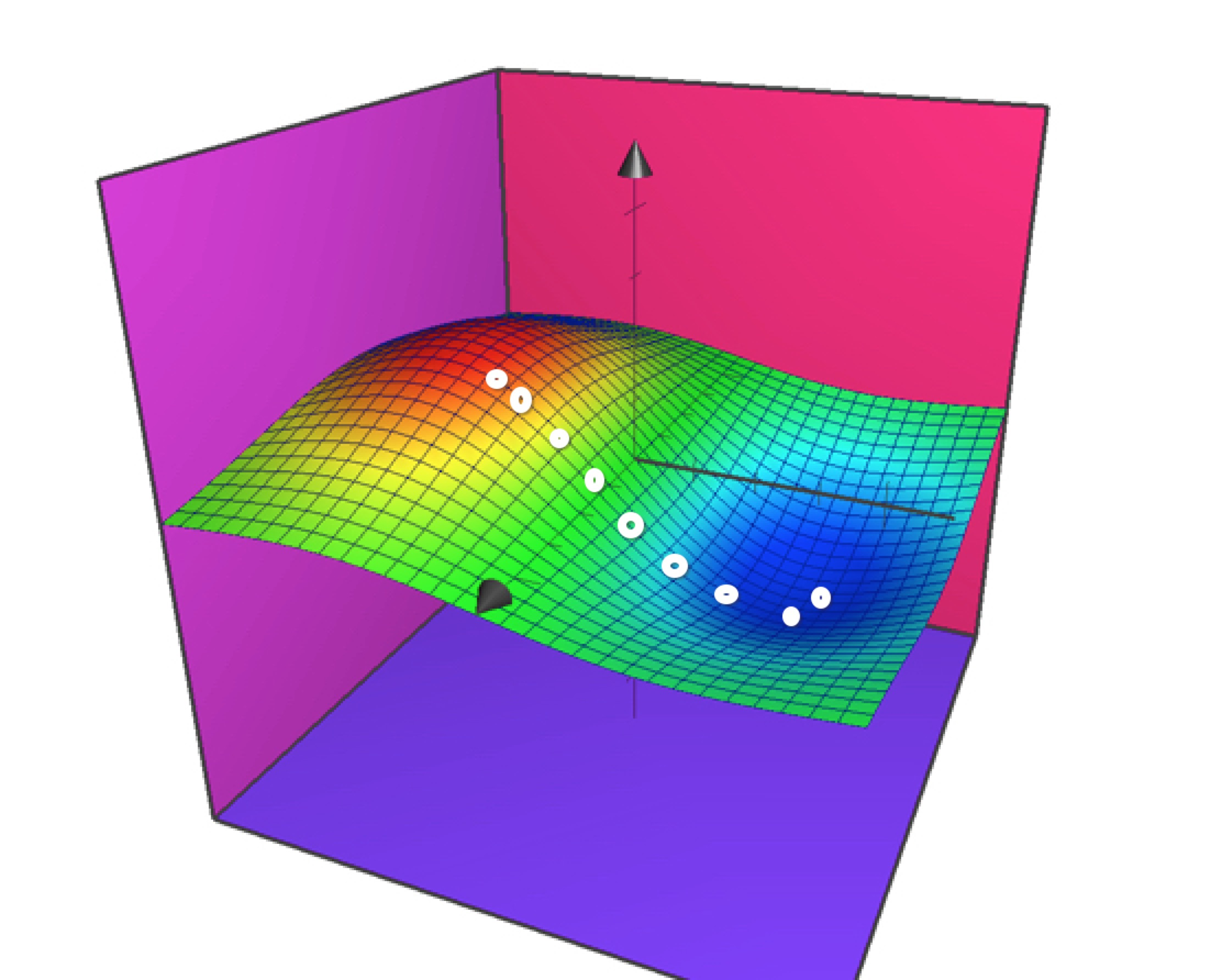 简单来说,就是先随便选一个a1和a2,比如下图中的红色部分的白点,计算出一个代价函数的值,然后通过求代价函数的偏导数,我们就知道了如何调整这个a1和a2,那么通过一步一步的迭代循环(这一步一步的迭代就是机器学习的过程了),沿着白点的路径,我们就可以走到图像蓝色的部分,从而得到满足最小值的a1和a2,这样可以通过有限的几次迭代运算,而不用求出全部的a1和a2来得到最小值。