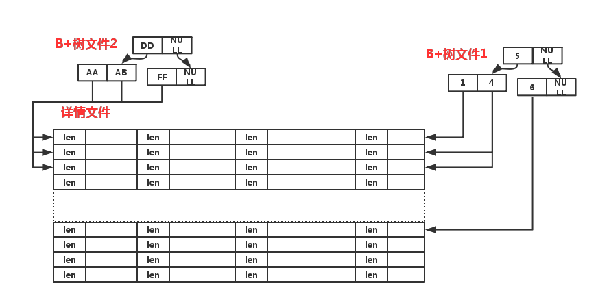 总之,数据底层我们就用了一个定长的二进制文件和几棵B+树,再加上一个meta信息文件来实现了一个数据库的底层数据层,很简单哈,但基本上包括了数据库真实的底层,虽然真正的数据库比这复杂多了,但也跑不掉这几个数据结构,整个看下来,数据层的数据结构大体上长这样子。