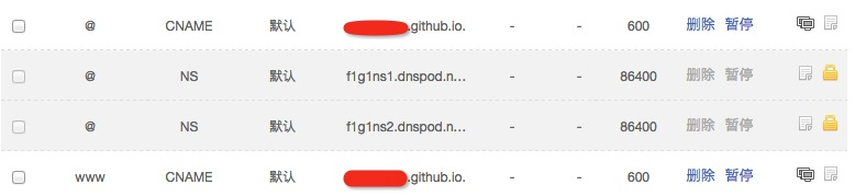 git add CNAME git push origin master - 到域名服务商增加你的CNAME记录。 添加两条记录,@和www的主机记录,记录类型为CNAME类型,CNAME表示别名记录,该记录可以将多个名字映射到同一台计算机。 记录值请写username.github.io.,值得注意的是io 后面还有一个圆点,切记。