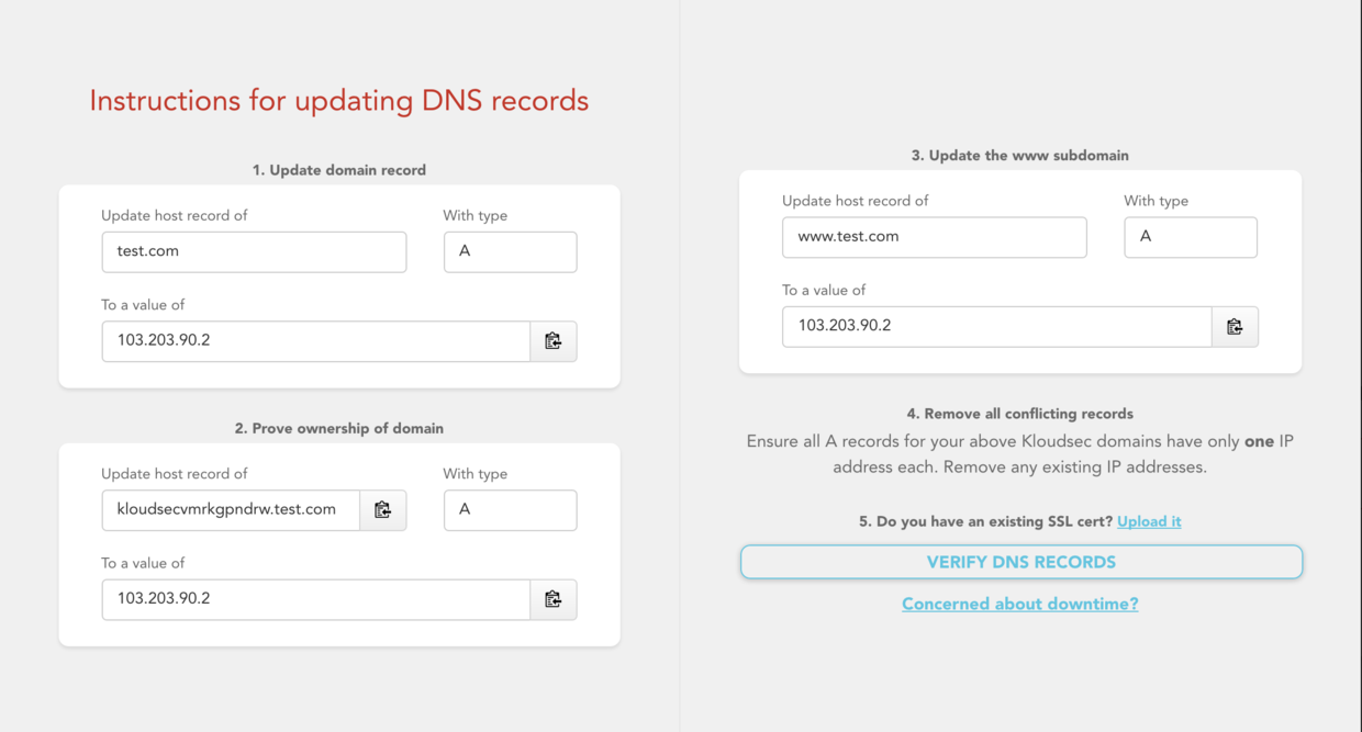 按照上面给的,要设置3个A的解析规则。设置完成之后点击Verify DNS records,如果通过,那么就可以接下来的设置了。