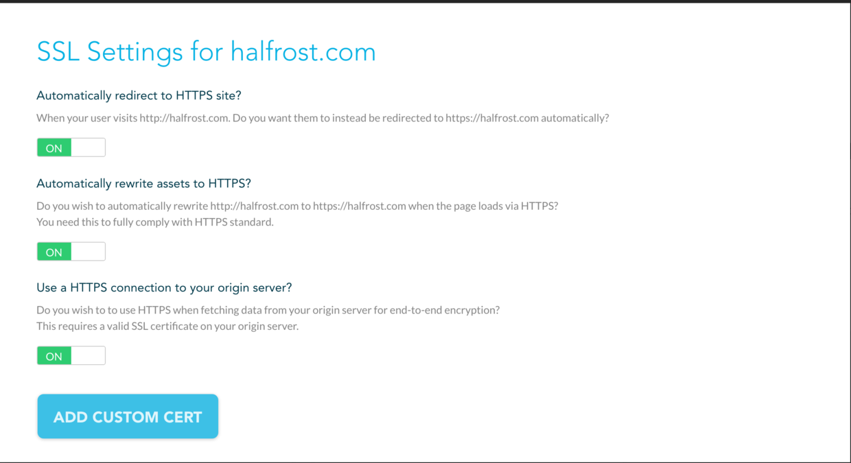 这里如果不上传自己的SSL,就会用它帮你生成免费的SSL证书。如果要用自己的,点击ADD CUSTOM CERT按钮上传SSL证书。