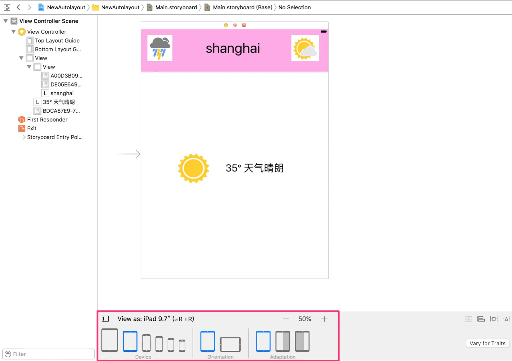 在说例子之前我们先来说一下Xcode 8在storyboard上新增了哪些功能。如下图,我们可以看到,在最下方新增加了一栏,可以切换不同的屏幕大小,可以看出,iPhone现在已经分化成6种屏幕大小需要我们适配了,从大到小,依次是:iPad pro 12.9, iPad 9.7 , iPhone 6s Plus/iPhone 6 Plus , iPhone 6s/iPhone 6, iPhone SE/iPhone5s/iPhone5, iPhone4s/iPhone4。下面还可以选择横竖屏,和不用屏幕百分比的适应性。