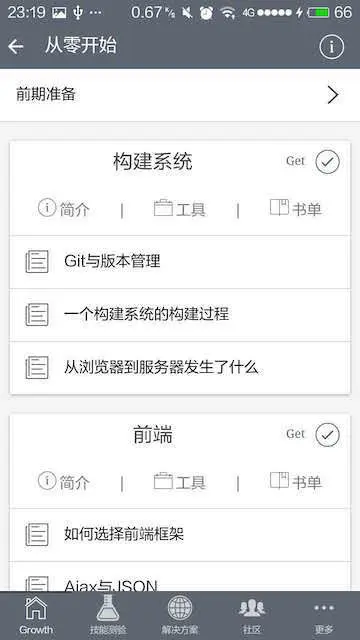 遗憾的是,上面的内容都是分散的,于是我们就有了Growth。它是一款专注于Web开发者成长的应用,涵盖Web开发的流程及技术栈,Web开发的学习路线、成长衡量等各方面。在这里,你将通过不断检验自己的学习成效,形成属于你自己的独一无二的个性技能图谱。