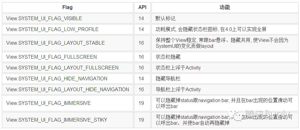 总共用到了5个Flag:SYSTEM_UI_FLAG_LAYOUT_STABLE保持整个View稳定,使View不会因为SystemUI的变化而做layout;SYSTEM_UI_FLAG_IMMERSIVE_STIKY,能够在隐藏的bar被呼出时(比如从屏幕下边缘开始向上做滑动手势),使bar在无相关操作的情况下自动再次隐藏;对于SYSTEM_UI_FLAG_LAYOUT_HIDE_NAVIGATION,开发者容易被其中的HIDE_NAVIGATION所迷惑,其实这个Flag没有隐藏导航栏的功能,只是控制导航栏浮在屏幕上层,不占据屏幕布局空间;SYSTEM_UI_FLAG_HIDE_NAVIGATION,才是能够隐藏导航栏的Flag;SYSTEM_UI_FLAG_LAYOUT_FULLSCREEN,由上面可知,也不能隐藏状态栏,只是使状态栏浮在屏幕上层。