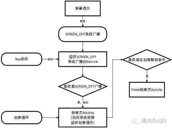 Android系统实现自定义锁屏页的思路很简单,即在App启动时开启一个service,在Service中时刻监听系统SCREEN_OFF的广播,当屏幕熄灭时,Service监听到广播,开启一个锁屏页Activity在屏幕最上层显示,该Activity创建的同时会去掉系统锁屏(当然如果有密码是禁不掉的)。示意图如下:
