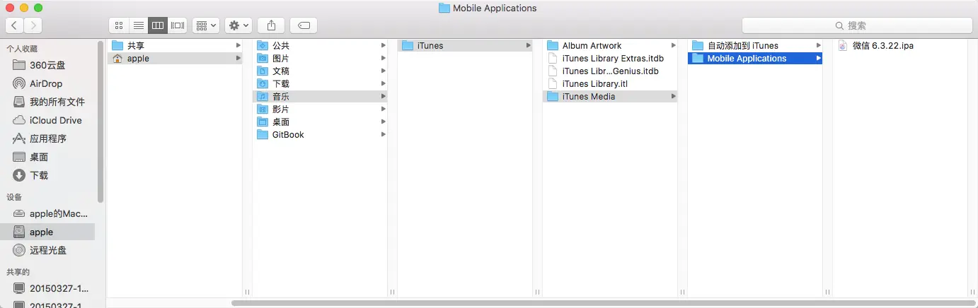 Mobile Applications目录下的就是你刚在iTunes里面下载的应用此处其实用终端更方便, 习惯用命令的同学自己尝试吧, 直接open到这个