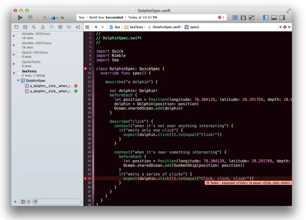 Swift里的单元测试,给Swift(好吧,要给Objective-C),和Xcode融为一体。如果你是一个Objective-C粉,我会推荐你Specta而不是这个,但对于Swift Quick很有可能是最好的。