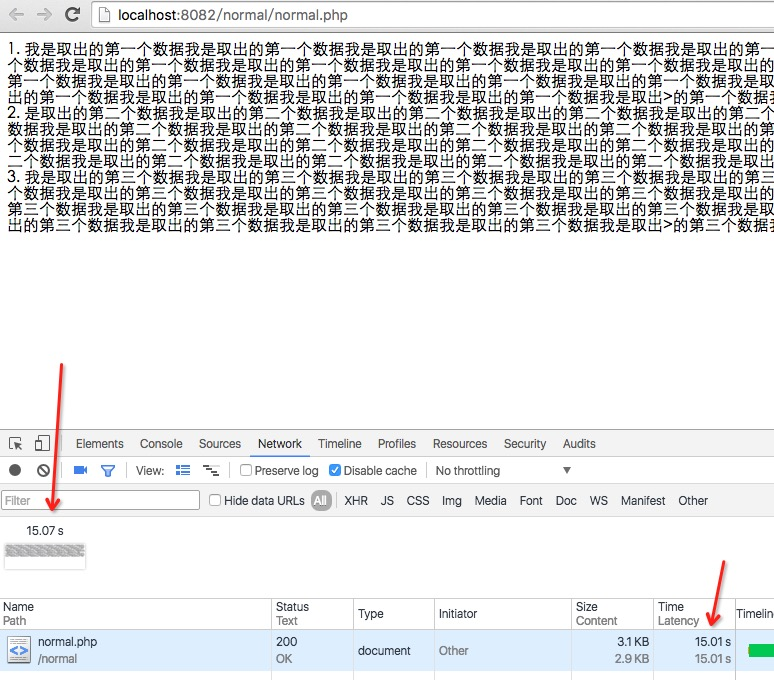 对比图图1.1.1与图1.2.2.1我们可以发现,虽然最后总的处理时长不变,但是采用了分段输出的网页,可以尽早的将一段HTML渲染到客户端,这样用户可以使用先到达的部分。另一方面,尽早的页面反馈,也可以减少用户等待的焦躁情绪。综上,使用此种优化方法,可以提速网页的渲染速度。