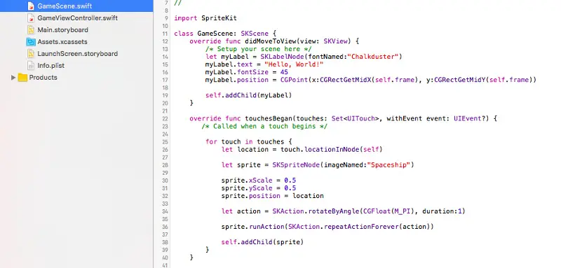 SpriteKit 也通常被引用为 sprites,是一个处理渲染,图形动画和图片的框架。作为一个程序开发者,你决定了改变什么,SpriteKit 就去处理显示这些变化的工作。你能在这里读到更多有关SpriteKit的内容。我也强烈推荐你去阅读 SpriteKit编程指导 获取更多框架提供的其他特性,例如处理声音的播放和 Sprite 物理模型。