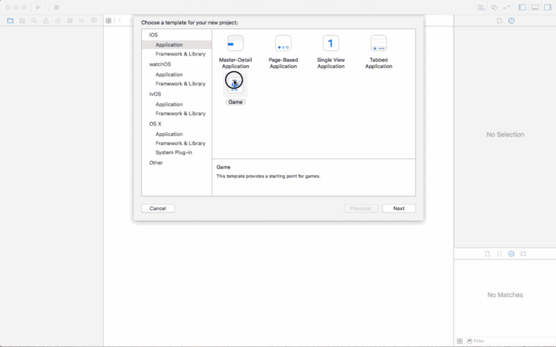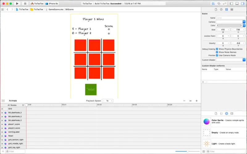 启动 XCode 并且通过为 iOS 设计的模板创建一个游戏项目。 命名游戏为 TicTacToe 并且确认编程语言设定为 Swift。在项目的创建过程中, XCode 创建了 SKScene 文件,它展示了游戏的初始视图,连同一个视图控制器文件用于初始化你的游戏场景并且处理在应用程序启动的时候展现在屏幕上。如果你现在启动应用程序,你会看到Hello World标签,它让你所有的东西都立即可以使用了。另外,如果你点击了视图,一个宇宙飞船会增加在你点击的位置。我们已经不再需要那个标签和宇宙飞船了,让我们移除那部分代码。切换到 GameScene.swift 文件,移除 didMoveToView 和 touchesBegan 方法中的代码。