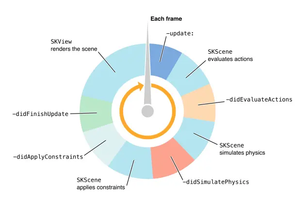 SpriteKit 处理你游戏的运行循环并提供多个地方让开发者在每一帧更新游戏内容。下图展示了每一帧从开始更新到最终渲染发生了什么。本质上来说,在每一帧你有很多机会来调整你的游戏。
