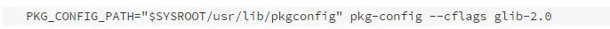“glib_cflags=$pkg_config --cflags $i“语句会获得glib的包含目录,看这篇文章的人如果电脑上安装有glib2.0可以通过这个命令进行查看输出内容:pkg-config –cflags glib-2.0。然而这个路径并不是我想要的,因为我现在是交叉编译,目标是ARM,所以我在这里将一个新的pkgconfig目录路径设置到PKG_CONFIG_PATH宏,输入下面的命令查看输出内容: