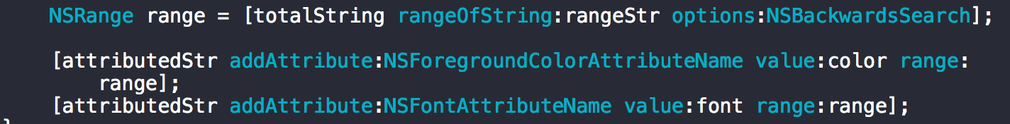 - (void)addAttribute:(NSString *)name value:(id)value range:(NSRange)range;示例: