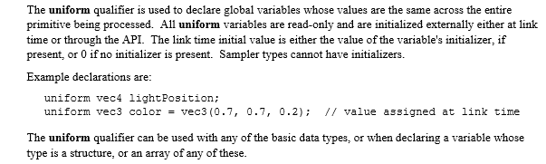 以上是opengl es3.2官方文档中对于 uniform限制符的描述,主要说了几点: