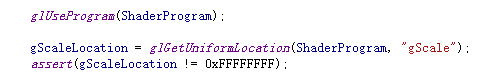 然后在链接期 生成一个uniform变量列表(variable’s initializer),如果需要设置着色器中gScale的值,必须先获取列表中的索引,通过glGetUniformLocation()函数获得。