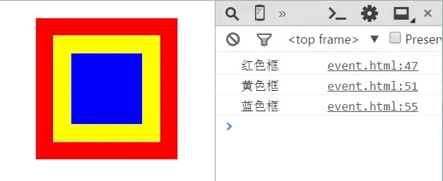 从最外层的document对象(浏览器其实是从window对象开始的)向内捕获事件,路过红色框时,查看到红色框有事件,但是红色框说:“我是在冒泡阶段执行,现在是捕获阶段,等你回来再说吧。”接下来是黄色框:“我在捕获阶段执行,就是现在执行!在控制台输“黄色框”吧~~”